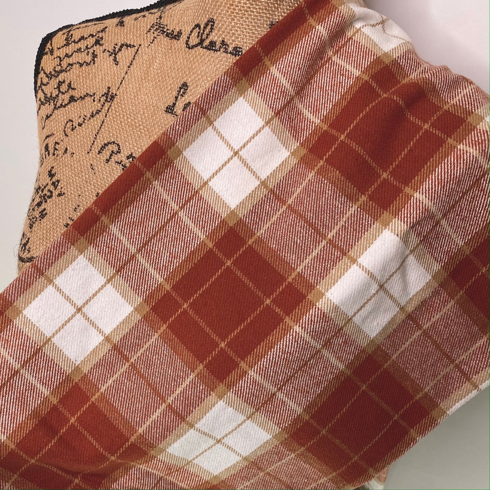 Pumpkin Pie Plaid with colors of Rusty Pumpkin Orange, Graham Cracker Crust Tan and Whipped Cream White.