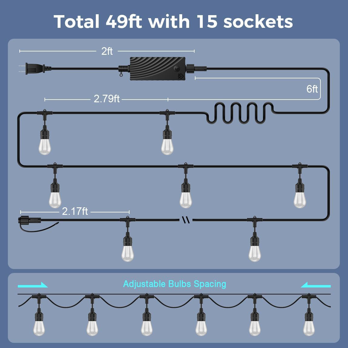 - 1 x 49 FT String Lights with 15 Sockets (For 98 FT: 30 Sockets)