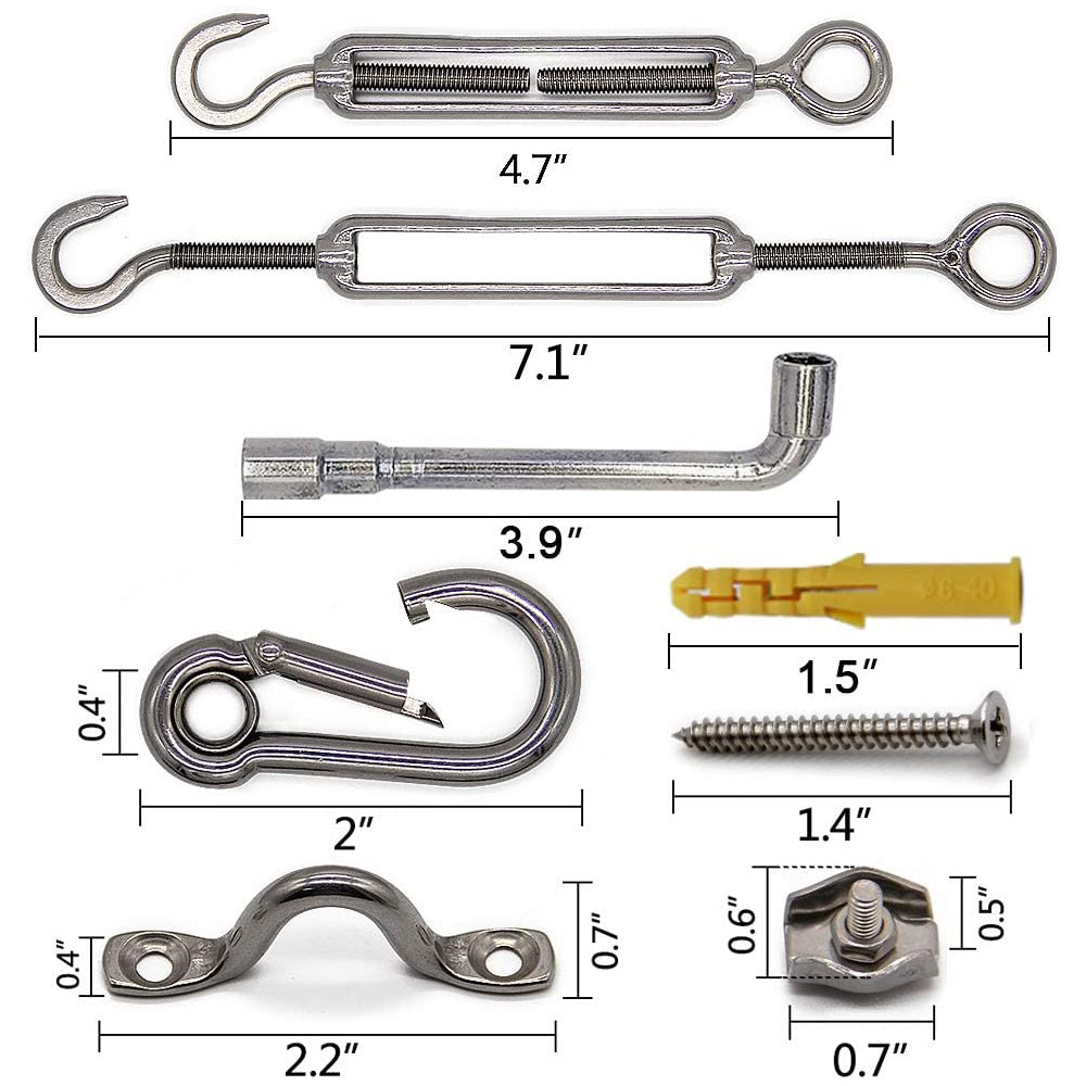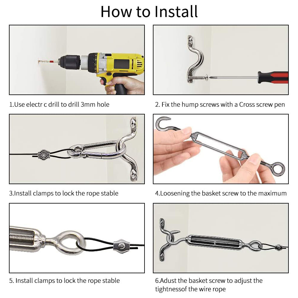 Package Includes: Wire Rope Cable (82 ft/164 ft), Snap Hooks, Turnbuckles, Eye Straps, Rope Clamps, Screws, Wall plug, Wrench.