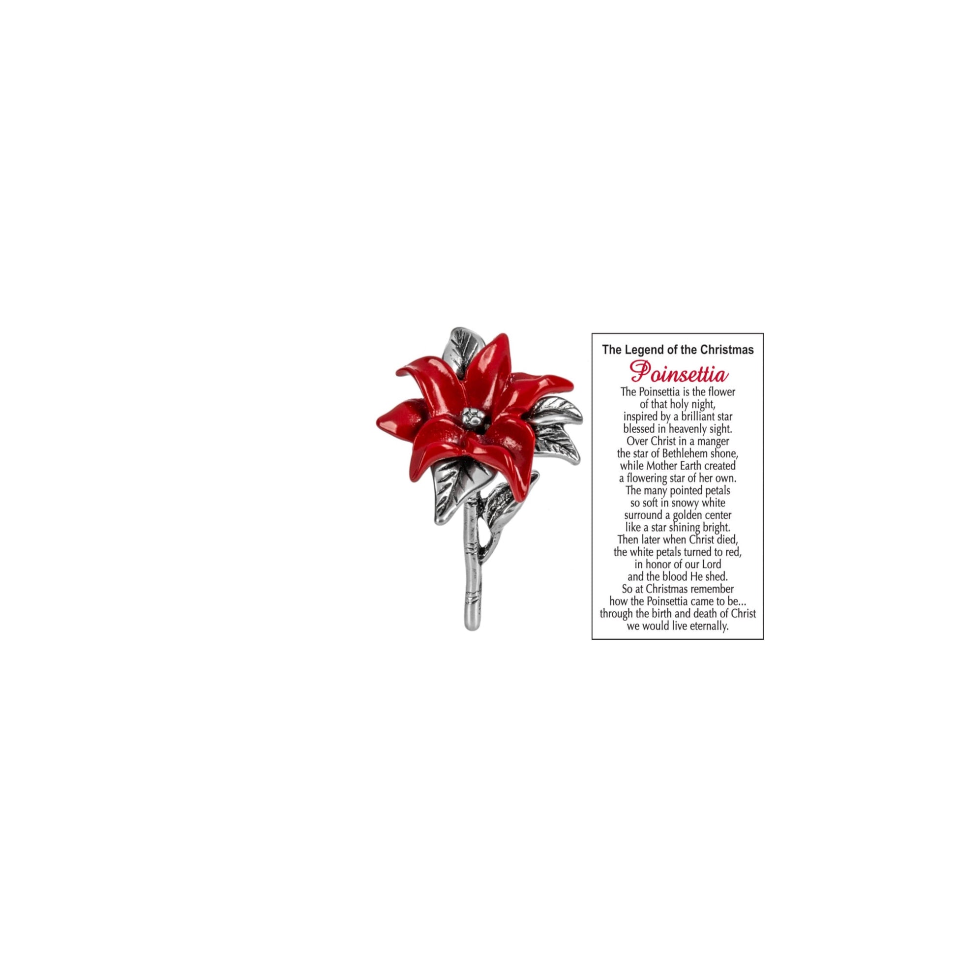 Accompanying the charm is an inspiring sentiment card that tells "The Legend of the Christmas Poinsettia." The card beautifully narrates how the poinsettia became a symbol of love and hope, connecting its vibrant red petals to the story of Christ's birth and life. This charming set is perfect as a thoughtful gift for loved ones or a meaningful personal keepsake that embodies the spirit of the holidays, serving as a reminder of faith, love, and the joy of the season.