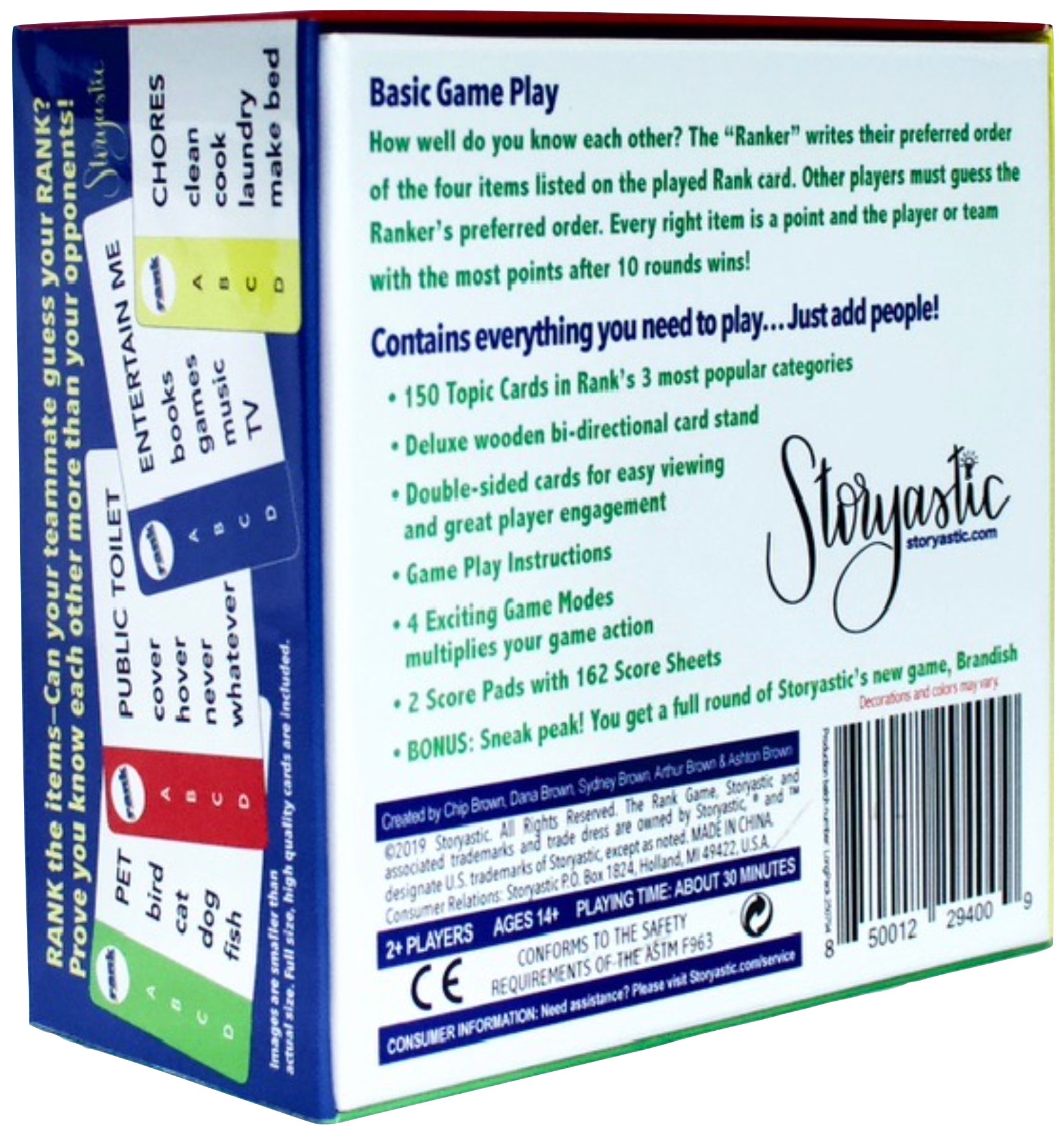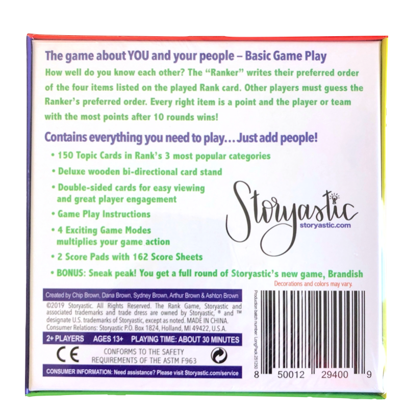 This SPECIAL EDITION includes all the main game components and The Rank Game's 3 most popular category packs: Everyday Life, Adulting, and Leisure Time. It also includes a BONUS SNEAK PEAK of 10 full rounds of Storyastic's new game, Brandish!