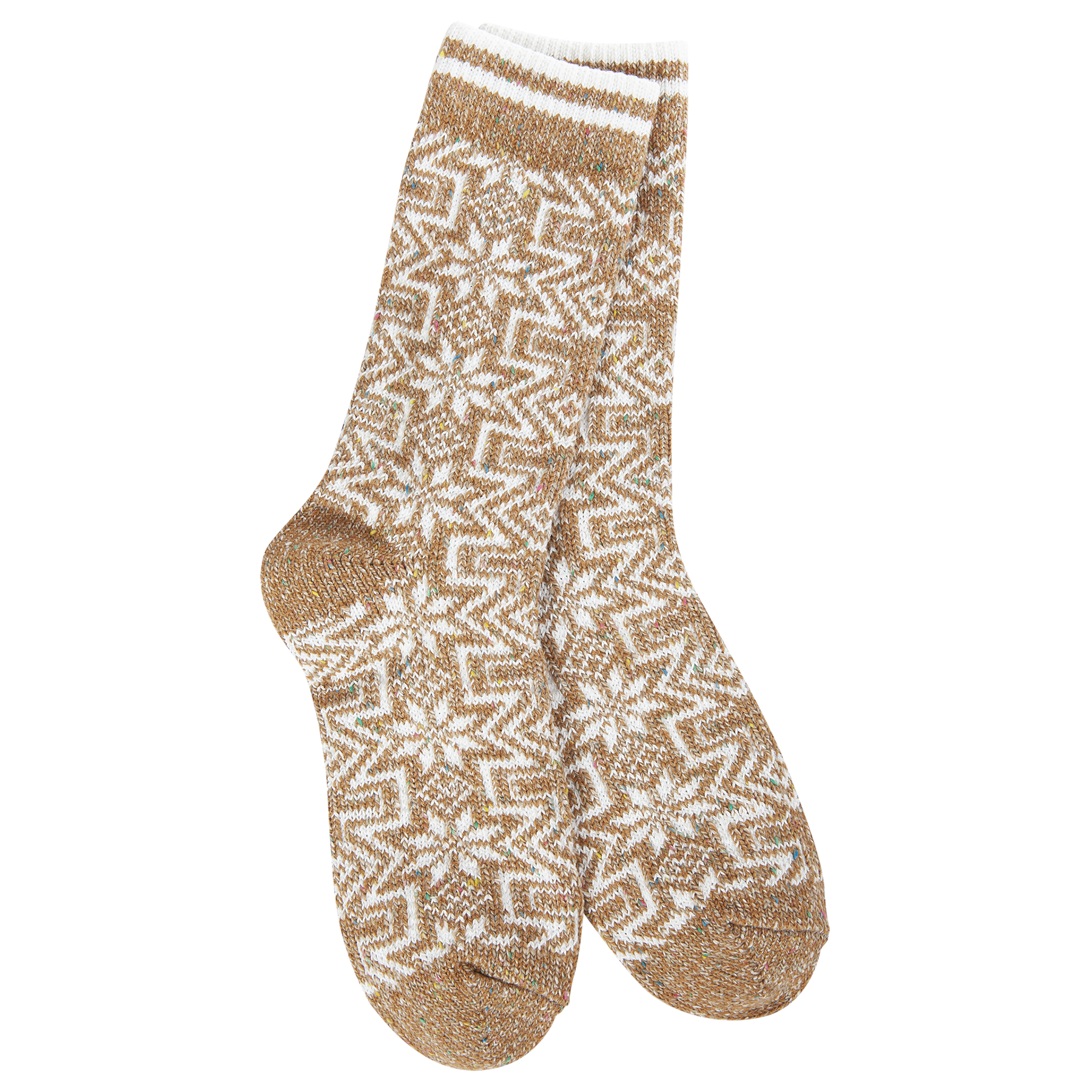 Get ready to celebrate the season with the Weekend Holiday Confetti Crew Socks in Geo Gingerbread! These festive socks feature a beautiful blend of warm gingerbread tones adorned with playful white geometric snowflake patterns, perfect for adding a cozy touch to your holiday wardrobe.